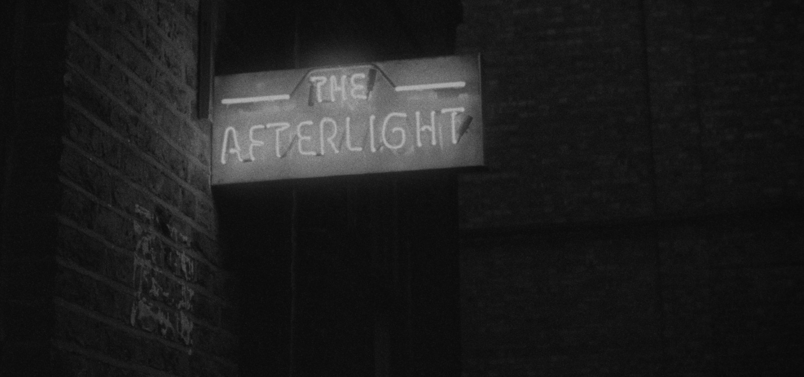 The narrative is loose. The film begins with characters walking alone at night through eerily empty, noirish streets, eventually converging on a bar illuminated by a neon sign: The Afterlight. Much of the film’s editing is suggestive of narrative events — scenes set at the bar, during a rainstorm, in an apartment — but there is no attempt to suggest absolute spatial continuity to the viewer. One more crucial detail: the film exists as a single 35mm print, which will deteriorate over time; edited digitally, all traces of the process were erased once the film was complete.