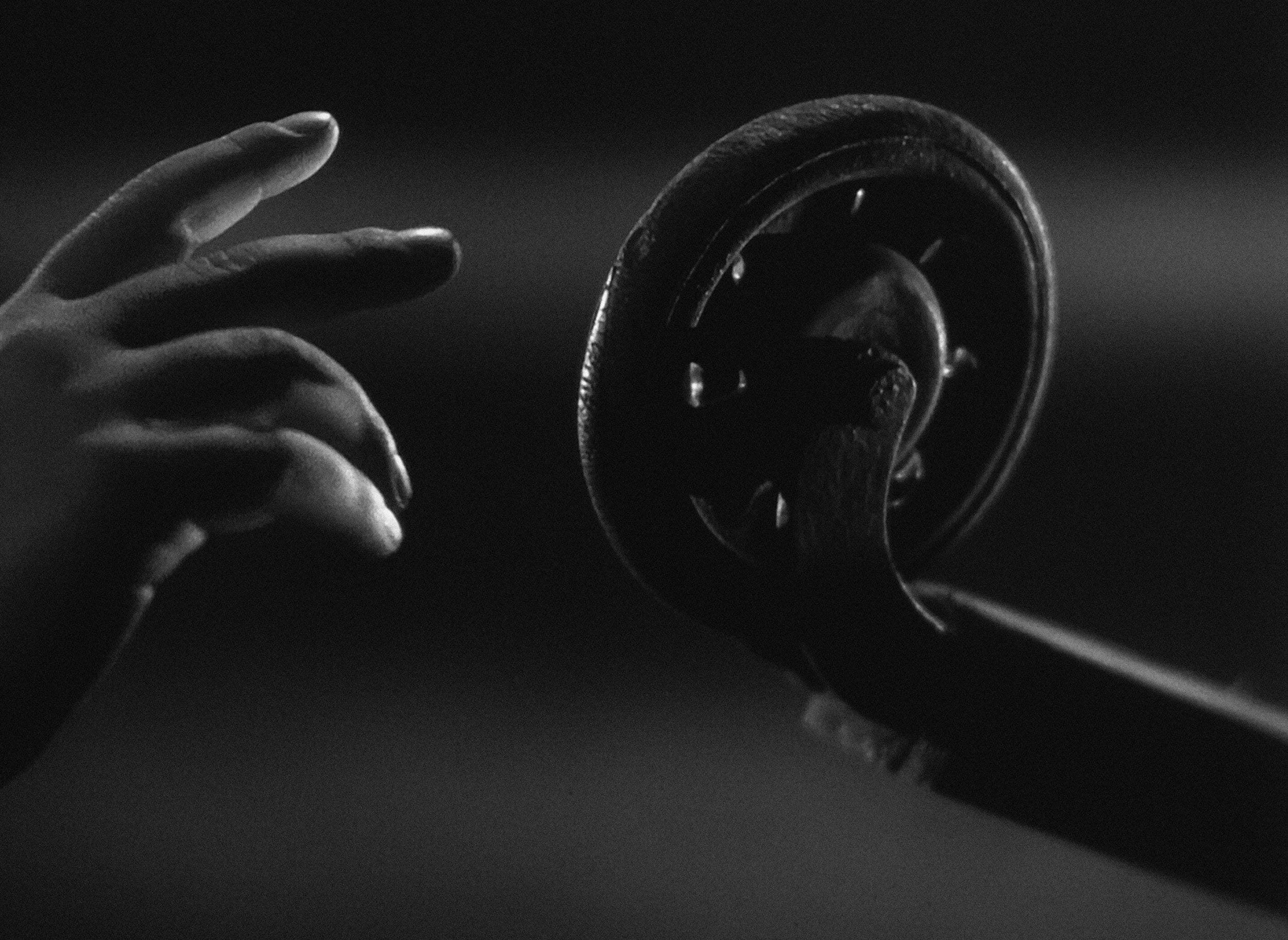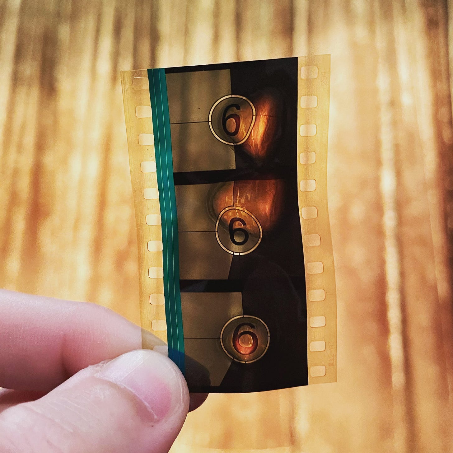 One change in particular, however, crosses over from the conceptually interesting into the uncanny. About twenty screenings in, Shackleton was handed three frames from the film which had been clipped out by another projectionist. These frames, part of the beginning of the film’s countdown sequence, had been burned through, leaving them scarred with ominous orange-red burns. Only later did Shackleton realise, as if a joke on the part of an already especially eerie film, that the frames which had been excised bore the numbers 6-6-6. A haunted medium indeed.