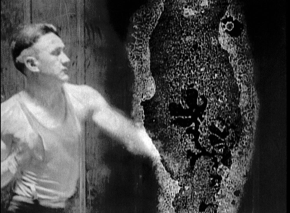 The Afterlight, then, takes as its starting point two conceits, the latter of which provocatively cancels out the former. First, with its cast of long-dead actors, it raises the idea of film as a haunted medium that promises its subjects immortality on the screen. Simultaneously, however, it forces us to confront the medium in its materiality — as something organic, corporeal, living — in order to remind us that cinema’s ghosts die too. Celluloid is a delicate material, subject to wear at the moment of projection, and to chemical deterioration even when stored in ideal conditions. Like a body, a film print is subject to injury, ageing, and eventually death.