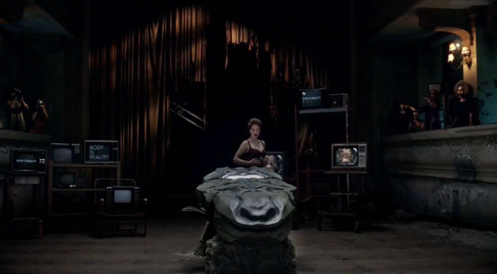 As Caprice and Saul are drawn into performing an art-world-autopsy on the corpse of a young boy, she insists to the boy’s father that “performance art is all consensual,” a simple line that captures so much of what makes Crimes of the Future so fascinating: the deliberate, explicit way in which it enters a dialogue with the ethics and aesthetics of performance art. At Caprice and Saul’s performances, as her machines rapidly enter him, his body sits in an elaborate surgical chair, surrounded by monitors that proclaim, in the vein of Barbara Krueger: THE BODY IS REALITY. This is a statement that rings true in the film, but only for a moment at a time, since these bodies, and what they can become, keeps on changing. Caprice insists that the art that she and Saul are creating is a way of making order out of chaos; as if removing his new, mutant organs is able to freeze them in time. Each organ extracted from Saul is sketched out, a kind of crude documentation.