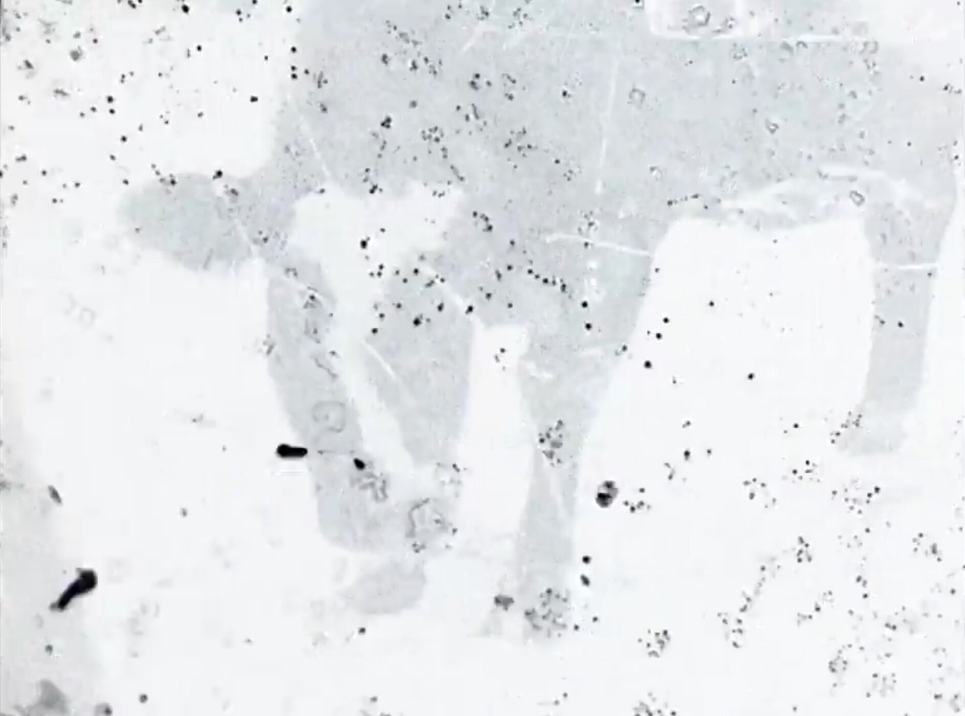 In his short, Psychic Meat, Stephen Wardell laments the inability of the processing to which he subjected the celluloid in making his film to convey the depths of his emotion. In fact, the effect is quite powerful. The film is a diary and act of bearing witness in which Wardell tells of his father’s artificial heart valve, the industrial farming industry that both provided the tissue for it and arguably hastened its necessity, and their somewhat distant father-son relationship. Wardell hand-developed this film in salt which resulted in a shimmering pock-marked effect on the celluloid which emphasises the film’s own materiality and physical precarity in line with the earthbound fleshiness of the maker’s voiceover narrative. However, the salt’s implications as a curing agent for meat and the way its visual impact brings together threads of preservation – of his father’s life, of their mutual love, of the detachment they have felt for years – and the latent imagery of these things hanging and curing over time, becomes quietly overwhelming.