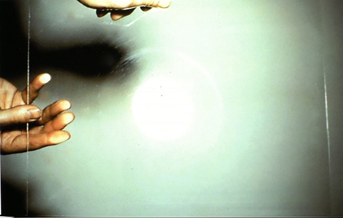 Slidelength, which came soon after Wavelength, takes the form of a slide-projector installation that includes stills from the original film and numerous photographs of the process of making it. These include images of gels that were utilised during filming; Snow’s hands regularly appear in the frame. He wanted to emphasise the physicality of his practice, in much the same way that the visible brushstrokes on a canvas connect the viewer to the physical practice of painting. Slidelength is a zoom out from Wavelength. Effectively a highbrow ‘making-of’ document, it allows the viewer to see not just through the camera’s lens, but outside the frame. The piece also adopts a sculptural quality, in that the projector stands proudly on a plinth which viewers can move around and walk behind; this further complicates the notions of projected space with which Wavelength is fascinated.