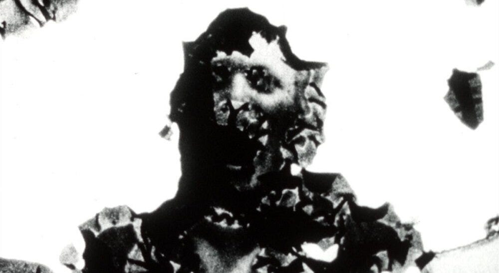 SB: The imagery was taken from a mix of DVD, Blu-ray, and VHS copies of the source films. I rephotographed it to 16mm, black and white, high contrast film stock. This stock was then hand-processed, and exposed to a number of methods for film ‘destruction’ - methods that allow the emulsion to fade or melt away. The idea is that I initiate a destructive process using either chemistry or heat or force, and then I stop that process before it completely destroys the image. This gives a great deal over to chance. Some of this material was reworked using a JK optical printer, which would allow for changes of rhythm and superimpositions that are particular to that instrument. All of the material was then scanned, and worked over again using a computer. Some sequences were also rephotographed to film from this intermediate for one more round of chemical distress. But much of the work from that point on involved bringing the footage into a digital workflow, using non-linear editing tools like Adobe After Effects and Premiere to create sequences, and at times mirroring the operations of an optical printer. This was an act of reasserting control over all of the chance-driven chemical processes. At the very end of this process, it was photographed back to 16mm film for projection.