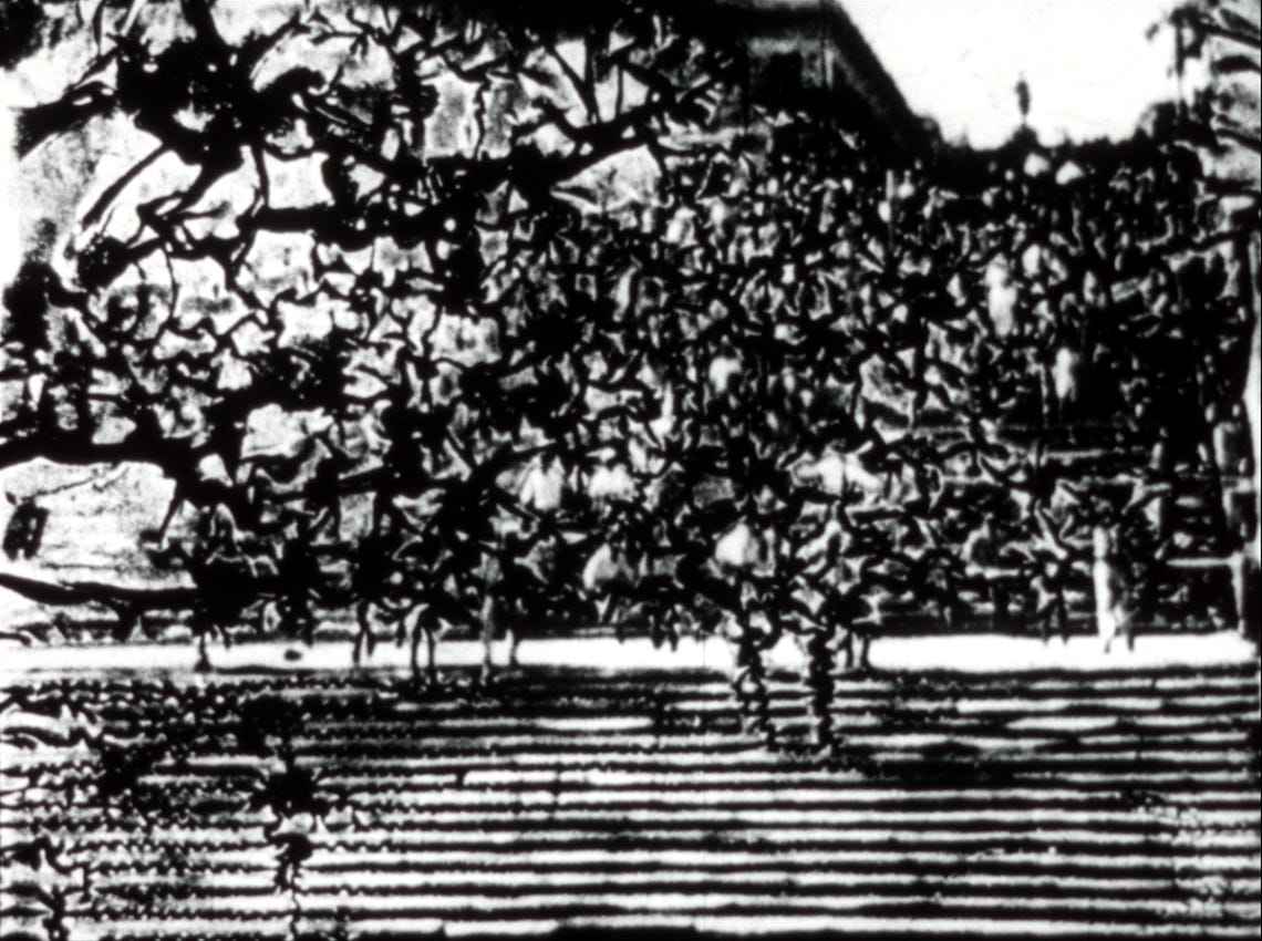SB: I have a real fascination with the development and restatement of themes. With few exceptions, each time a motif is used in one of these films, it is different. It may be different in some indiscernible way, but, sure enough, you won’t find the same frame repeated twice. With motifs I am establishing parameters for improvisation. Perhaps an image, or an image sequence, will repeat in some variation every three or four minutes; the region of the film that serves as a bridge between those variations is a playground. And by establishing motifs early, and feeling the flexibility to change them, or even to abandon them, I am able to surprise myself with the directions a work moves in. With Potamkin, there are a few motifs that have special significance: the rotating about-face crowd from Dovzhenko’s Earth; the fever-struck face from Pabst’s Westfront 1918; the lowering coffin from Griffith’s This Day and Age. I don’t assign these gestures a narrow meaning, but they have specific meaning to me. I leave it open because they may have different meanings for you, but also, because unassigned meaning empowers the viewer to connect these images. In this case, the relation of these three images is also caught up in Soviet montage, in the semiotic trap of Lev Kuleshov. But for me, motifs are also about keeping time, and they provide an undercurrent, a skeleton, for the rest of the images to tie together.